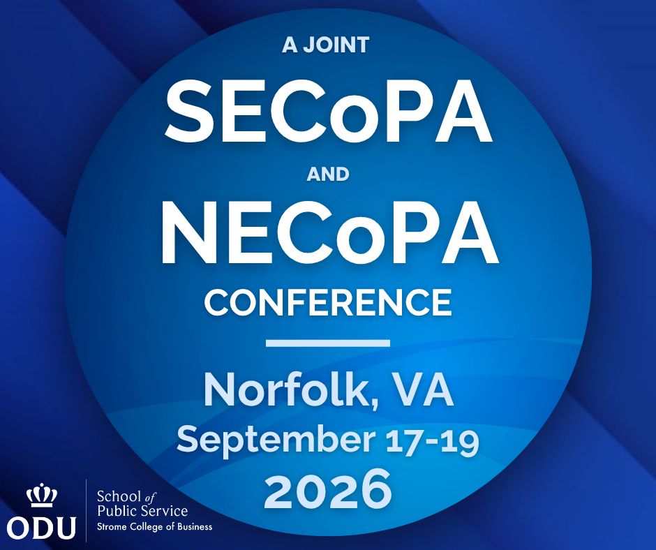 Northeast Conference on Public Administration We are excited to announce that the #NECoPA2026 will be coming to Virginia at Old Dominion University in September 2026, in partnership with SECoPA!!! More details to come soon! Important Links! Coming SOON for 2026! NECoPA 2026 Registration NECoPA 2026 Sponsorship NECoPA 2026 Proposal Submission Share this: Click to share on X (Opens in new window) X Click to share on Facebook (Opens in new window) Facebook