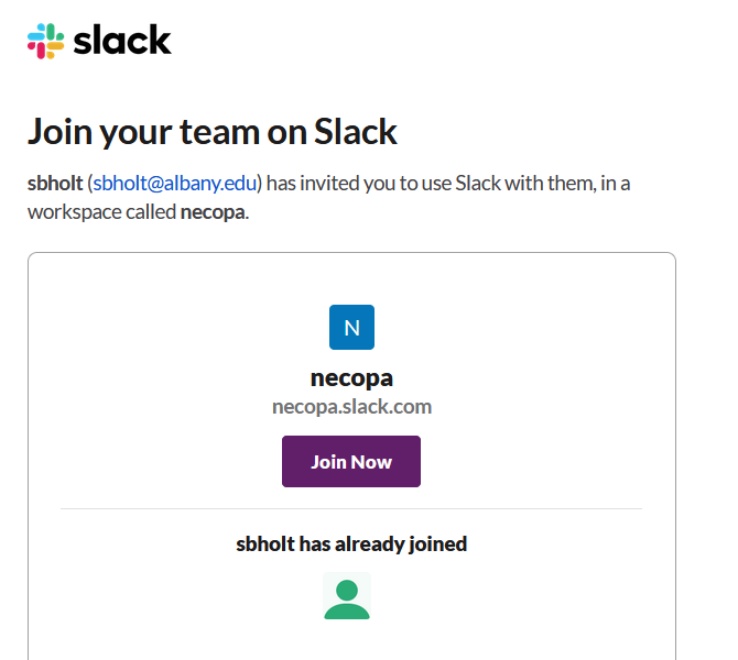 We will also be using Slack to organize the conference. Slack has a variety of features that make it attractive for a virtual conference: you can message users directly in side chats; panel tracks can have dedicated channels for focused conversation, comment sharing, and networking; announcements can be sent conference wide on the fly; information can be organized for clarity and ease of access. Anyway, some of you may not have experience with Slack, so this section of the update is going to walk through the basics. In the coming week or so, you will receive an email with an invitation to join the conference Slack. The email will look something like this: